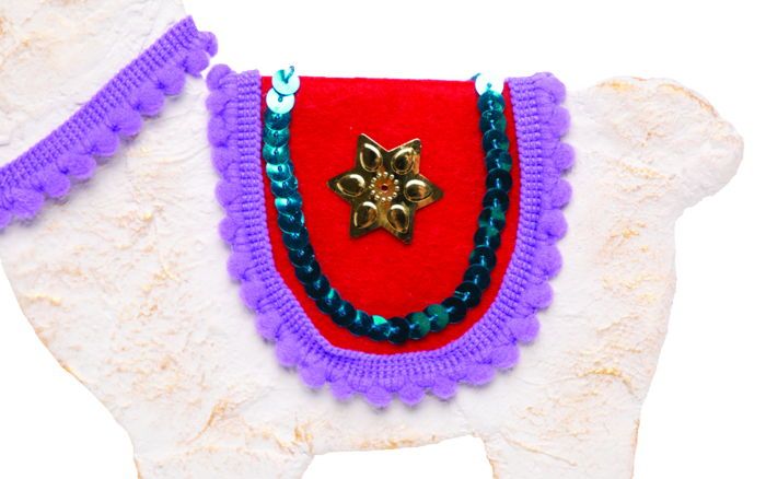- Cut a curved piece of felt (approx 8cm x 8cm) for the blanket. Glue it onto the body with sequin strings, pompom ribbons and a jumbo sequin to decorate. Glue a piece of pompom ribbon around the neck and legs with sequin strings.