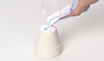 5. Place a flowerpot upside down onto a covered surface, then slowly pour the paint onto the centre of the bottom of the pot until the whole of the flowerpot is fully covered in paint. Leave to dry overnight.