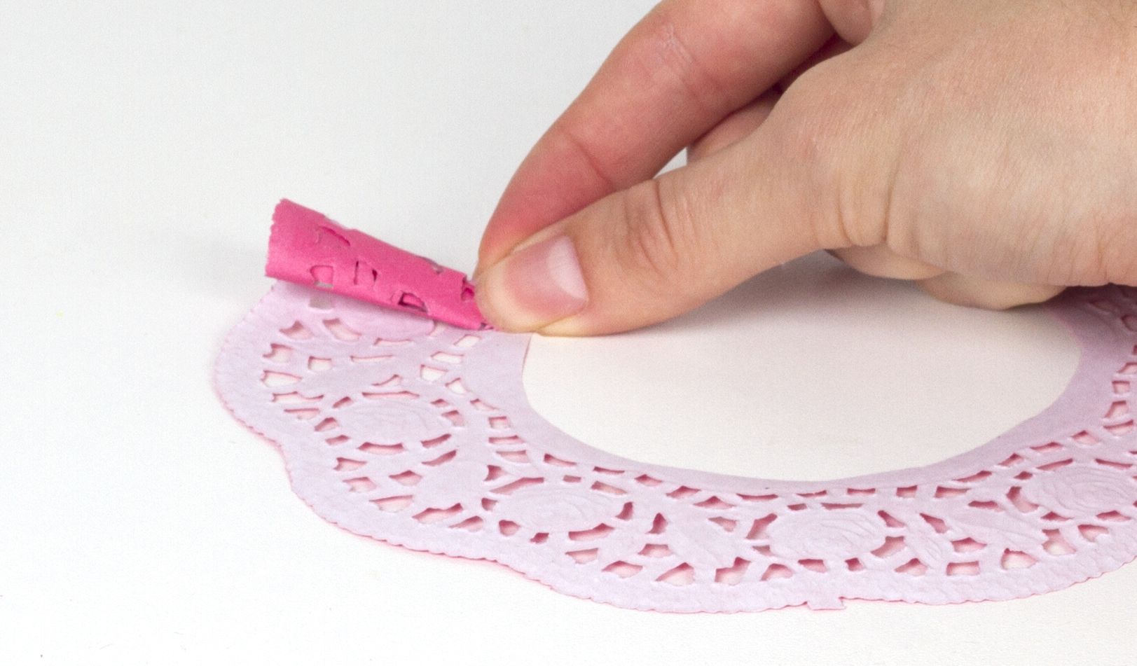 - Cut a slit in the ring and start to roll up the doily from one end. Gather the doily as you roll it up, pinching it at the bottom, to create the petals.