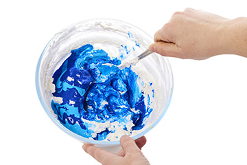 - Mix up the puffy paint. Start with 1 cup of plain flour. Add 1 cup of PVA glue. Squirt 2 cups of shaving cream into a bowl and mix them all together then separate the mixture into two bowls and add a generous squirt of green and blue paint in each.
