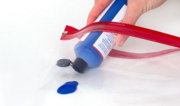 3. Squeeze some yellow paint into the centre of the bag, making sure it doesn't mix with the blue paint.
