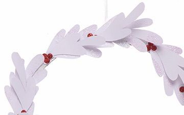 - With a hole punch and red glitter card, punch out 30 circles. These will be the berries. Stick these down at the base of the small leaf stem following cut out shape. When glue has dried, wrap stem lightly around a pencil to curve it up slightly. This will give dimension to the wreath.