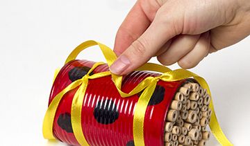 - Take the paper off of a clean tin can, then cover it in a coat of red paint and leave to dry. Once dry, paint on some black spots to make it look like a ladybird.